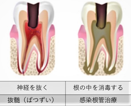 歯の根っこの治療とは2種類に分けられ、専門的には「抜髄」と「感染根管治療」と言われています。