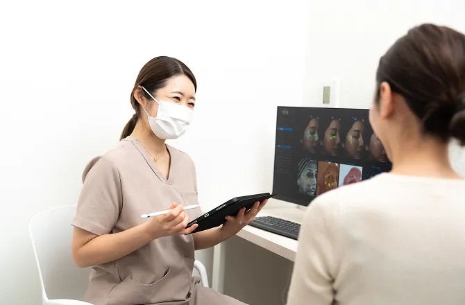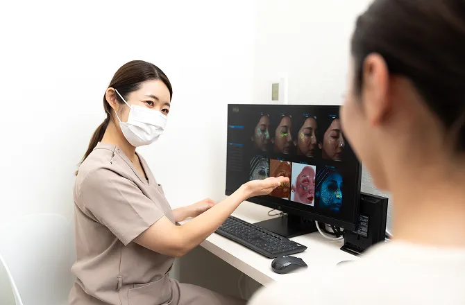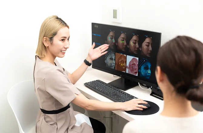 問診票をもとに、ナースまたはカウンセラーが事前にご希望を伺います。その後、肌診断機を使用して、肌の状態を数値と画像で分析します。肌質、生活習慣、お悩みに合わせた施術プランのご提案に役立てます。当院で施術を受けられる方は、肌診断を無料でご利用いただけます。